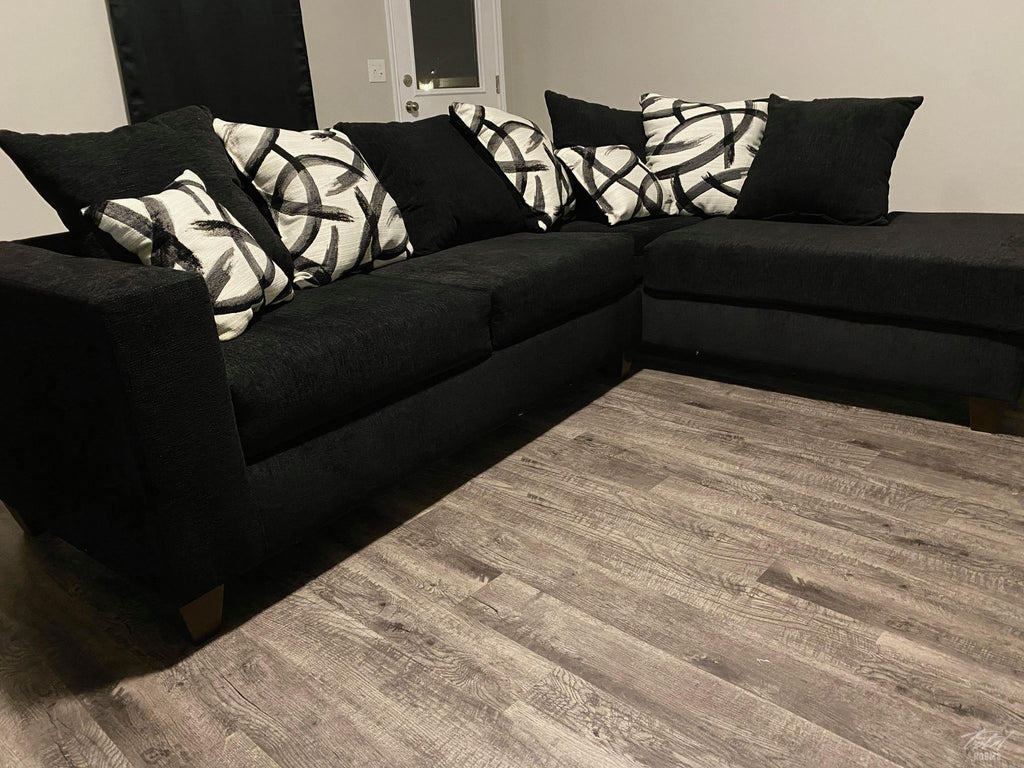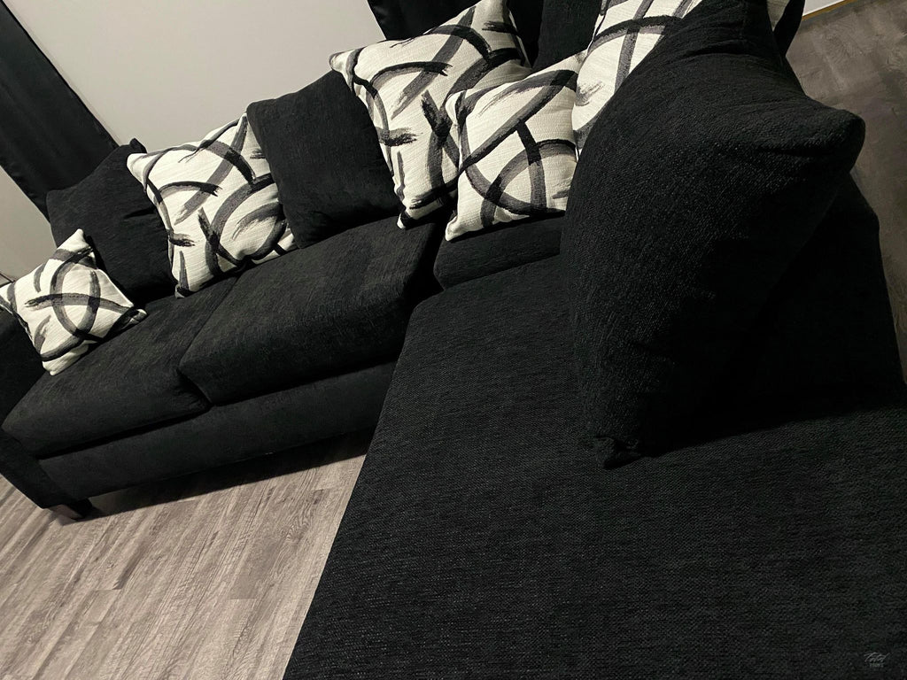 Elevate your space with this striking Black Sectional, a bold statement piece that commands attention while maintaining versatile design appeal. The deep black upholstery creates a dramatic focal point, grounding your room with contemporary sophistication. Paired with included throw pillows, this sectional invites layered styling and personalized comfort customization. Its expansive seating layout accommodates gatherings effortlessly, while the sleek silhouette preserves visual lightness despite its substantial presence. Built for both aesthetics and durability, this sectional serves as a foundational investment for modern living spaces seeking understated elegance with impact.