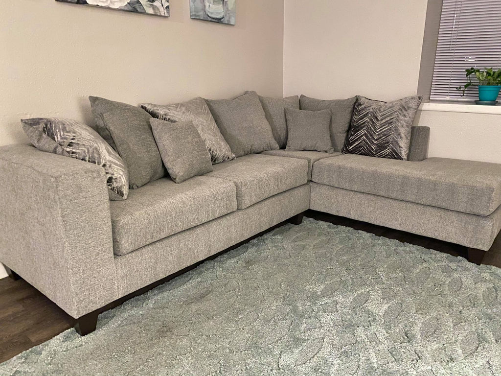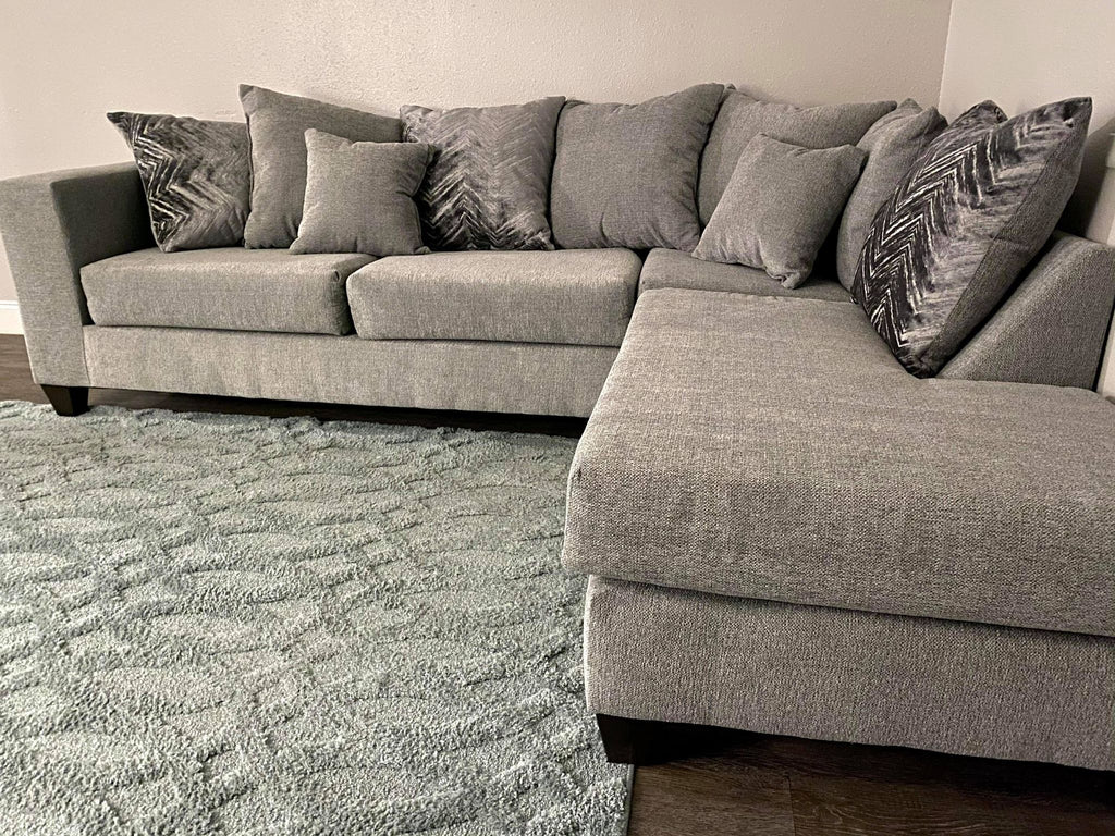 Sink into comfort with this sophisticated Dove Grey Sectional, thoughtfully designed for modern living spaces. The neutral grey upholstery complements any décor while providing a versatile foundation for your room's aesthetic. This sectional arrives complete with coordinating throw pillows, adding instant layered comfort and visual interest. Perfect for lounging, entertaining, or creating a cozy family gathering spot, this piece combines style with functionality. The generous seating accommodates multiple guests while maintaining an elegant silhouette that won't overwhelm your space.