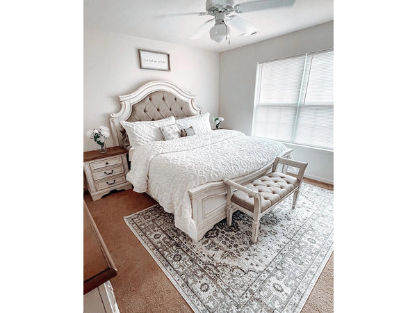 Our unique chipped white finish is meticulously applied to give each piece an authentic, time-worn character, adding depth and warmth to your bedroom.